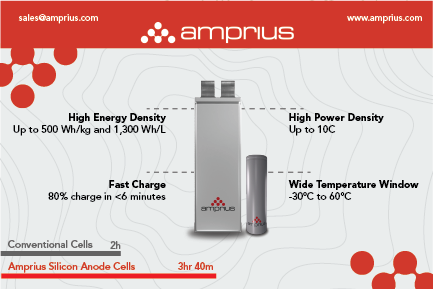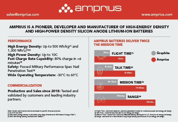 Design starts with understanding who the target audience is and incorporating that data into the brand identity. Simple flat colors accent the product statistics and showcase the most important points Amprius wanted to showcase.